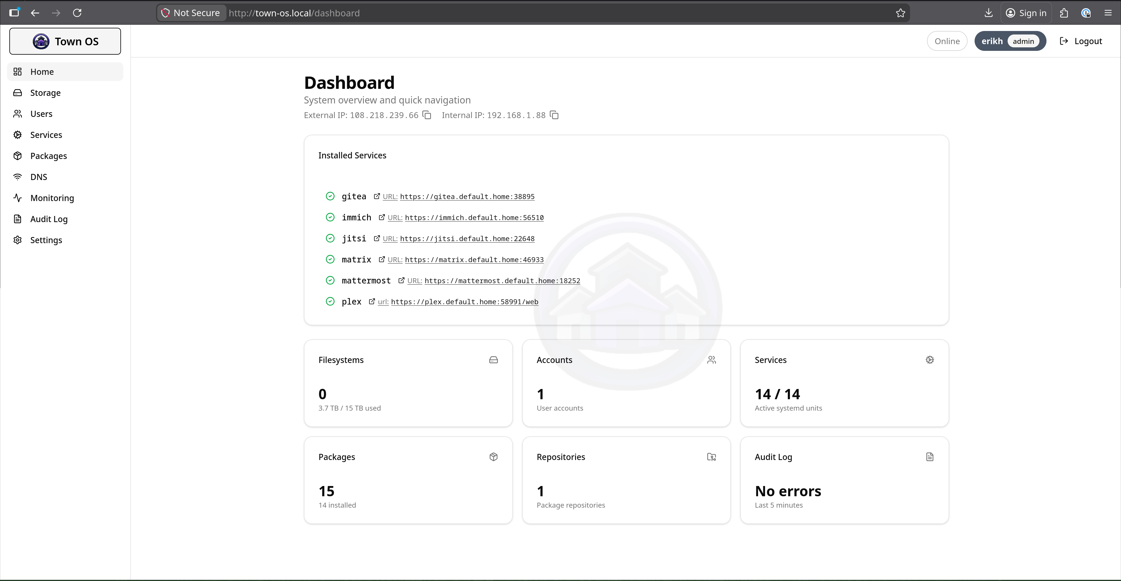 See Town OS in action. These screenshots show the current development build — a fully working dashboard for managing packages, services, storage, and users.