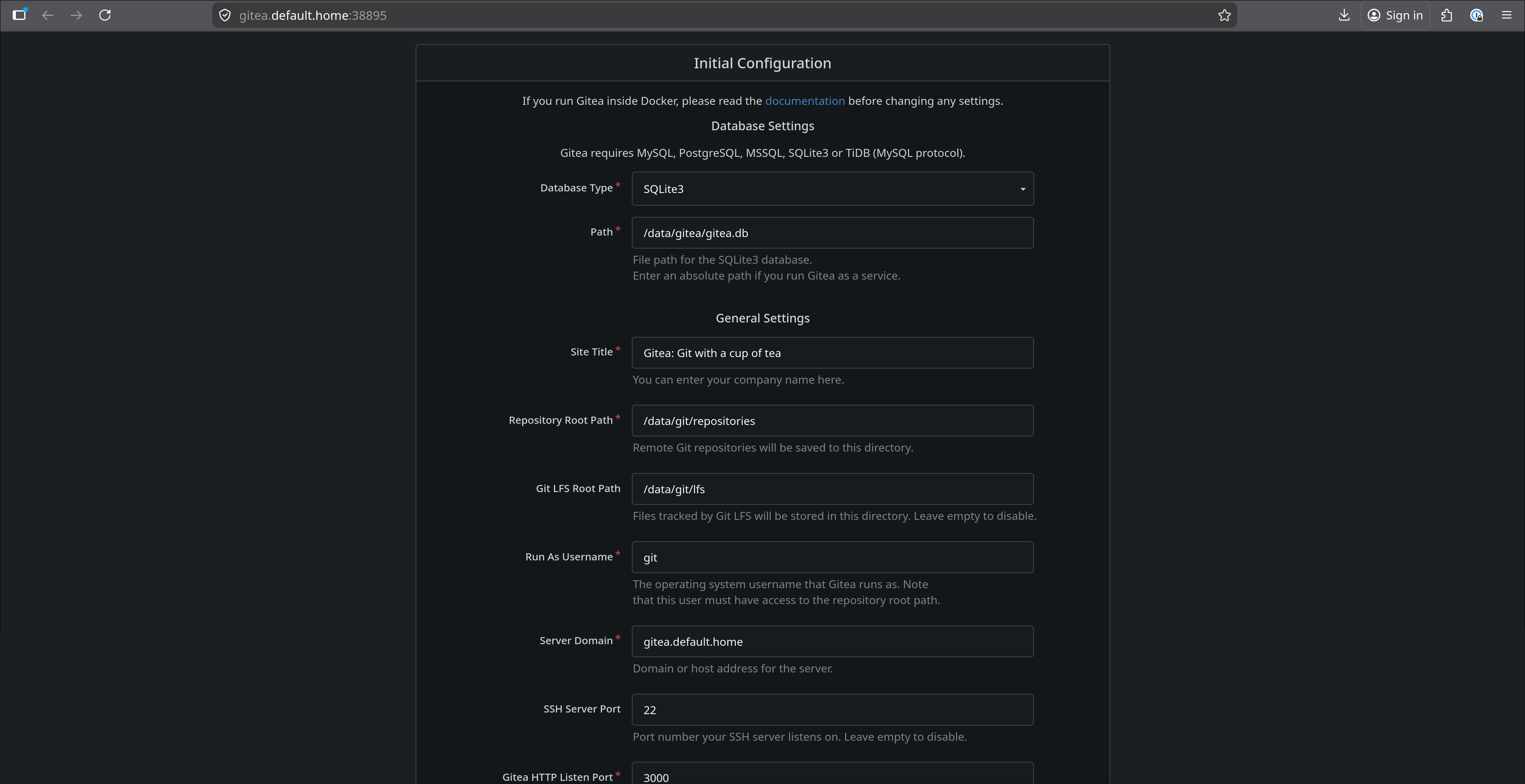 Gitea reachable from any device on the network at gitea.default.home, resolved by rolodex.